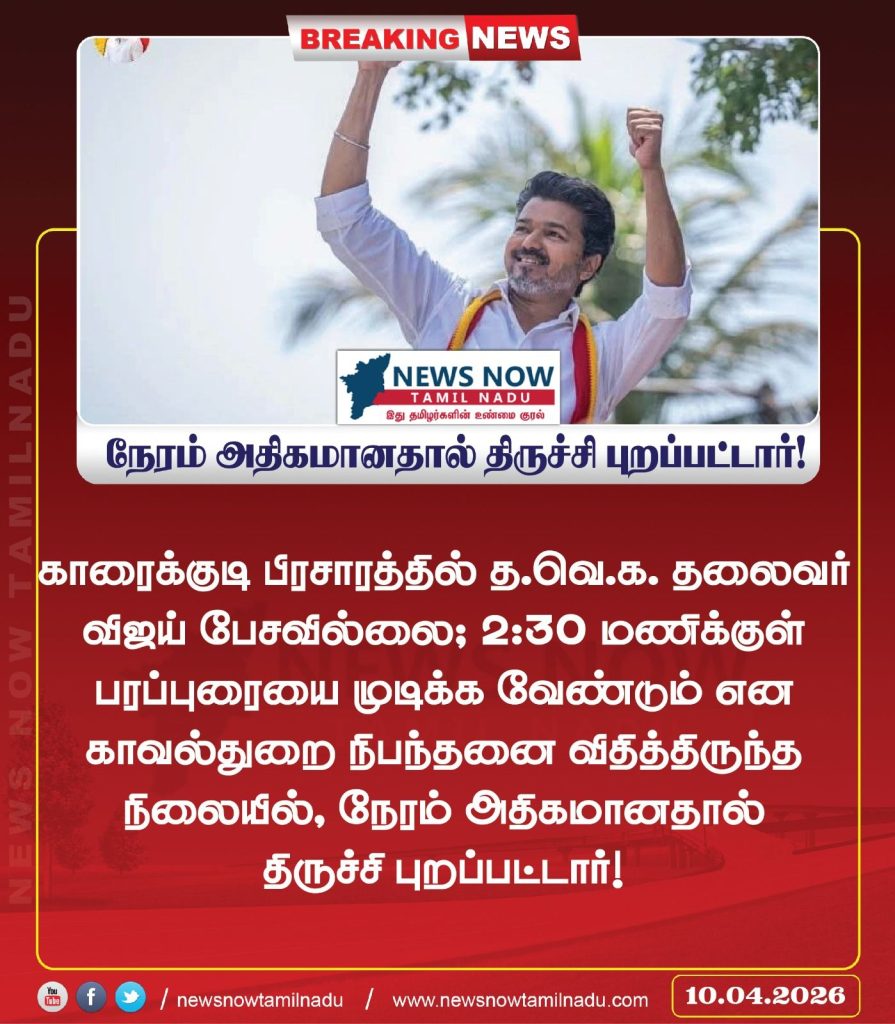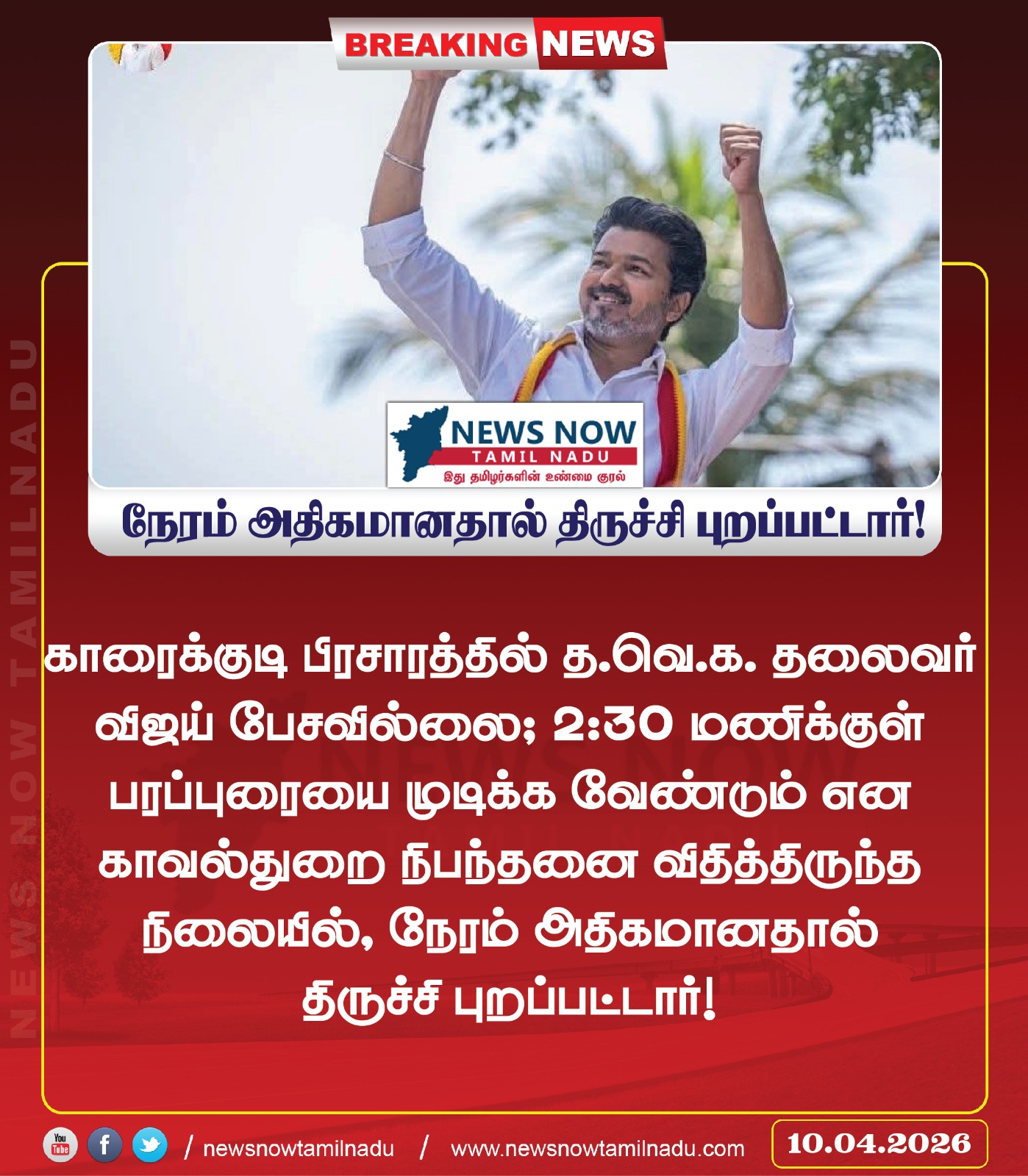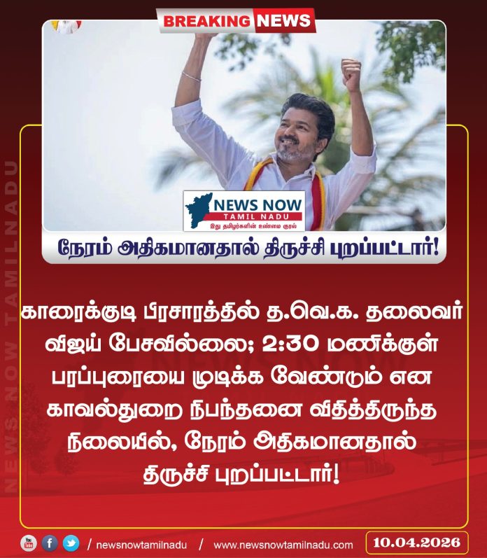 காரைக்குடி பிரசாரத்தில் த.வெ.க. தலைவர் விஜய் பேசவில்லை; 2:30 மணிக்குள் பரப்புரையை முடிக்க வேண்டும் என காவல்துறை நிபந்தனை விதித்திருந்த நிலையில், நேரம் அதிகமானதால் திருச்சி புறப்பட்டார்!