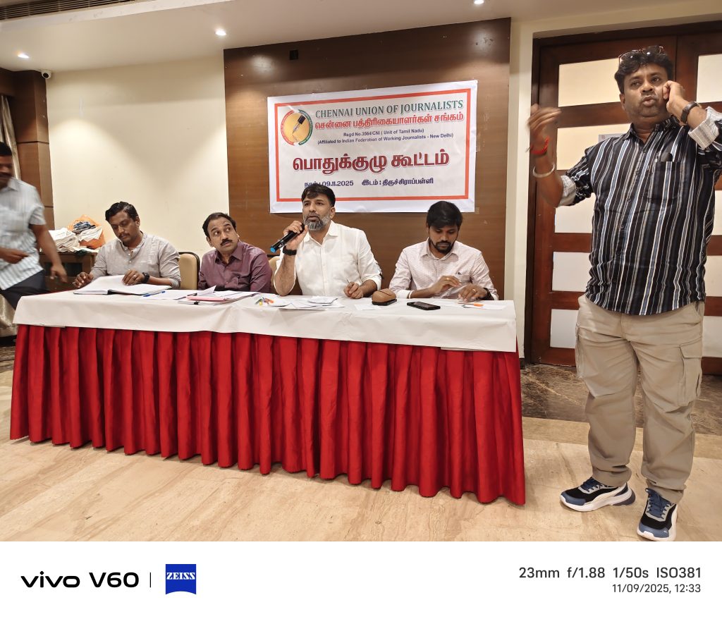 9.11.2025 திருச்சி தனியார் ஓட்டலில் சென்னை பத்திரிக்கையாளர்கள் சங்கத்தின் சார்பில் காலை 11 மணி அளவில் பொதுக்குழு கூட்டம் நடைபெற்றது இந்த கூட்டத்தில் பத்திரிக்கையாளர்கள் நலன் குறித்து தமிழக அரசிடம் 17 கோரிக்கைகள் முன்வைத்து ஒருமனதாக தீர்மானங்கள் நிறைவேற்றப்பட்டன.