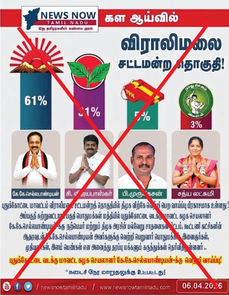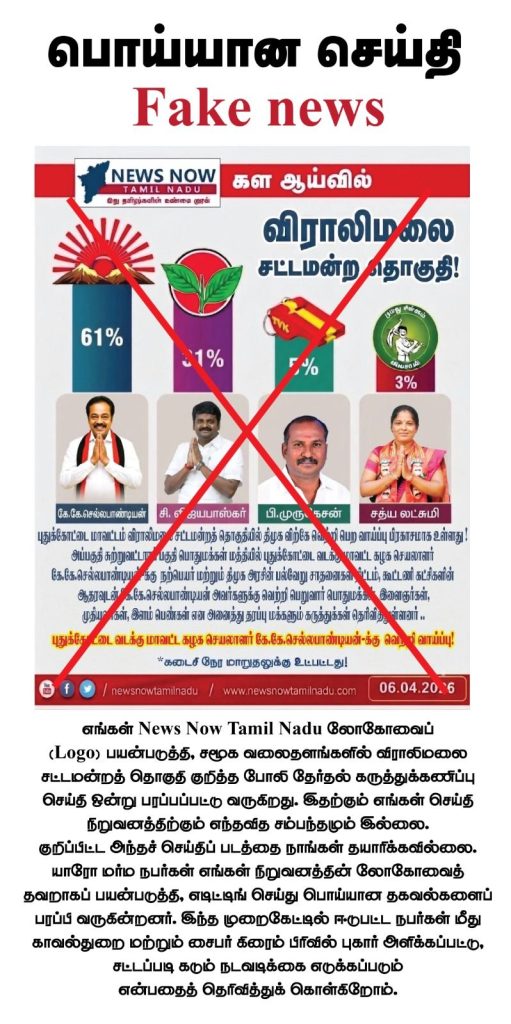 எங்கள் News Now Tamil Nadu லோகோவைப் (Logo) பயன்படுத்தி, சமூக வலைதளங்களில் விராலிமலை சட்டமன்றத் தொகுதி குறித்த போலி தேர்தல் கருத்துக்கணிப்பு செய்தி ஒன்று பரப்பப்பட்டு வருகிறது.