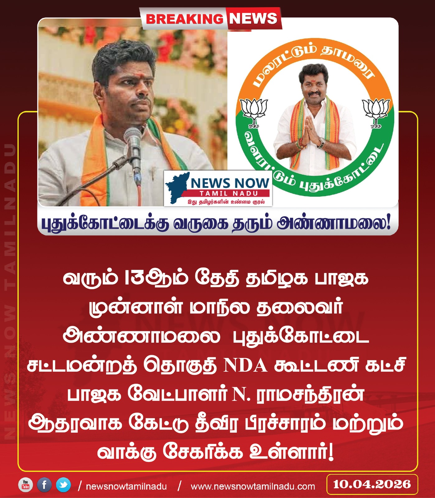 வரும் 13ஆம் தேதி தமிழக பாஜக முன்னாள் மாநில தலைவர் அண்ணாமலை புதுக்கோட்டை சட்டமன்றத் தொகுதி NDA கூட்டணி கட்சி