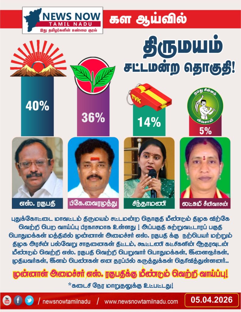 ரகுபதி க்கு நற்பெயர் மற்றும் திமுக அரசின் பல்வேறு சாதனைகள் திட்டம், கூட்டணி கட்சிகளின் ஆதரவுடன் மீண்டும் வெற்றி எஸ். ரகுபதி வெற்றி பெறுவார் பொதுமக்கள், இளைஞர்கள், முதியவர்கள், இளம் பெண்கள் என தரப்பில் கருத்துக்கள் தெரிவித்துள்ளனர்..